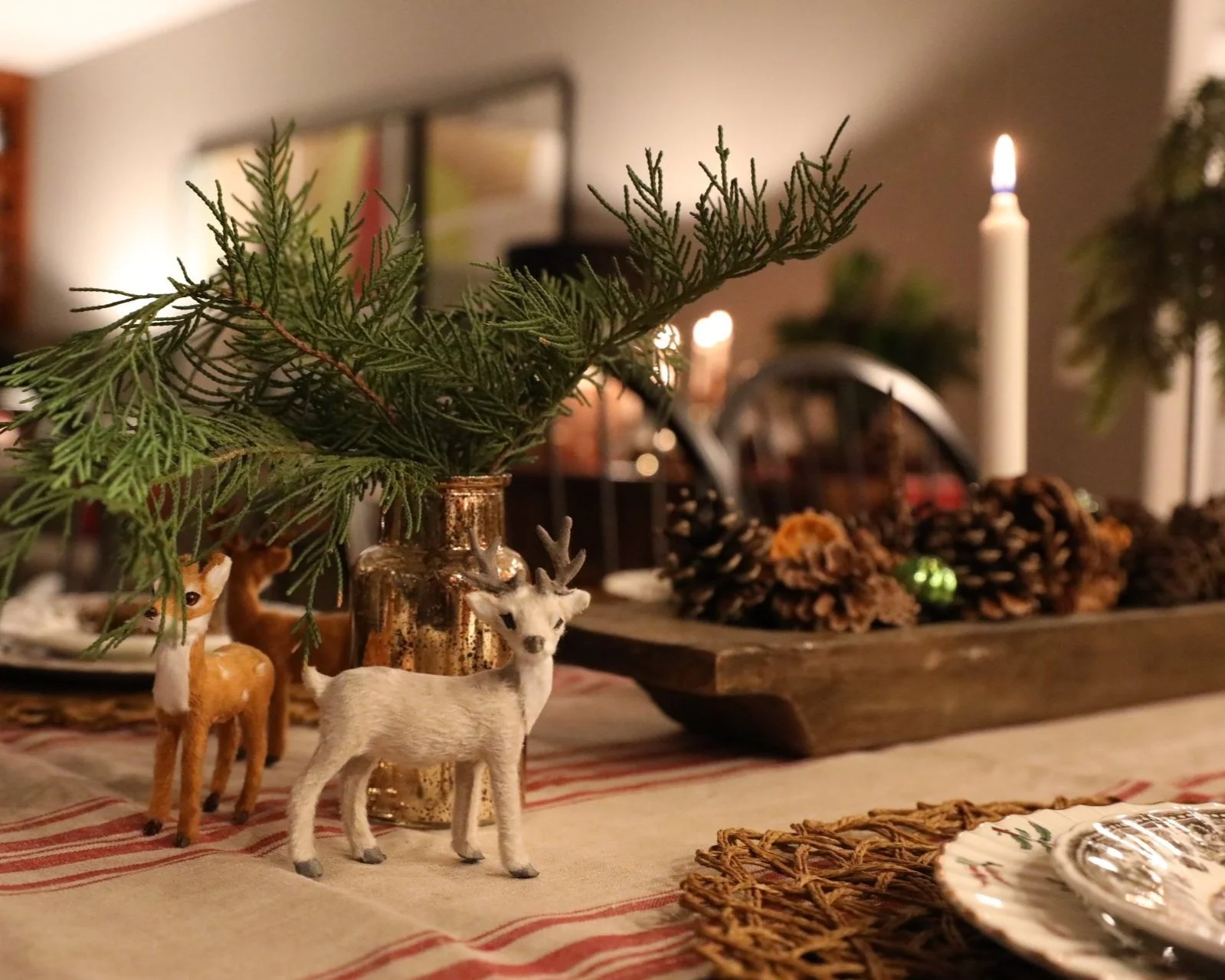 At each end of the wood bowl I added a small gold vase with fresh greens and three deer.