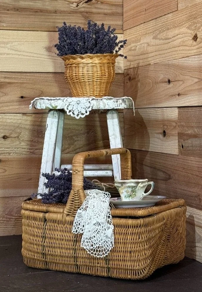 Picnic baskets are readily available at thrift stores and yard sales for very reasonable prices. Consider collecting a few for fun and function!